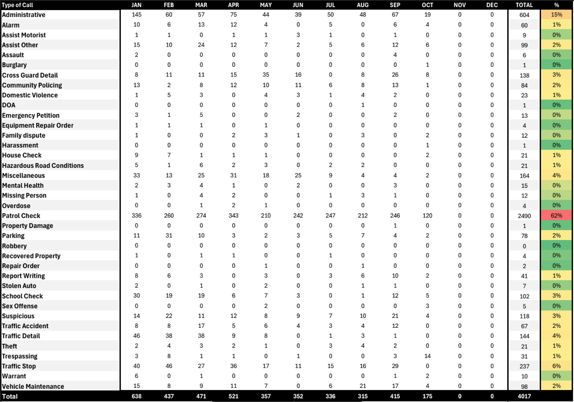 We track all of our calls for service so that we can communicate the highest areas of crime to our community and help ensure your safety. Each month, we’ll update the stats shown here with last month’s calls.